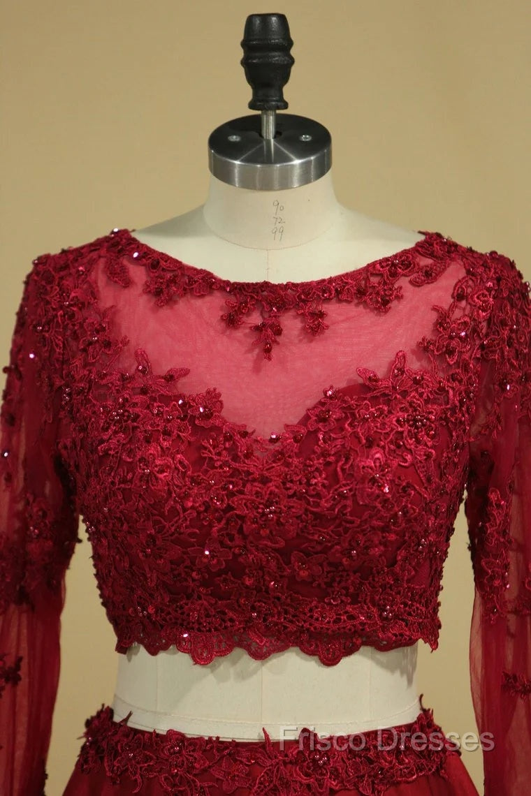 Cheap Burgundy Two-Piece Formal Prom Dress A Line Satin Lace Applique