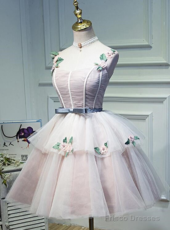 Cute Pink Tulle Short Flowers Lace Layers Formal Dresses, Pink Short Homecoming Dresses