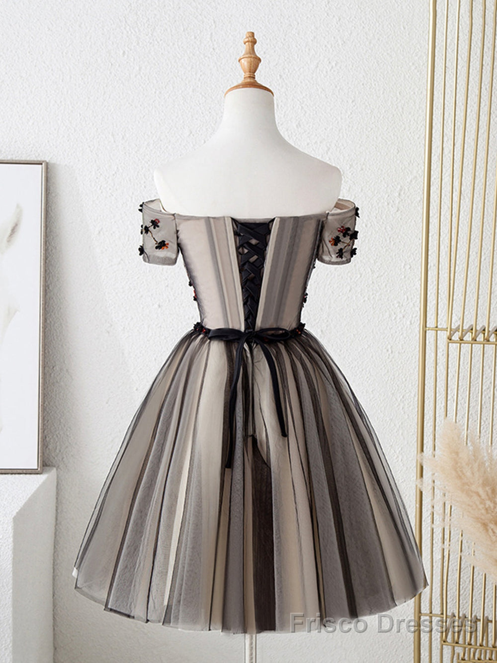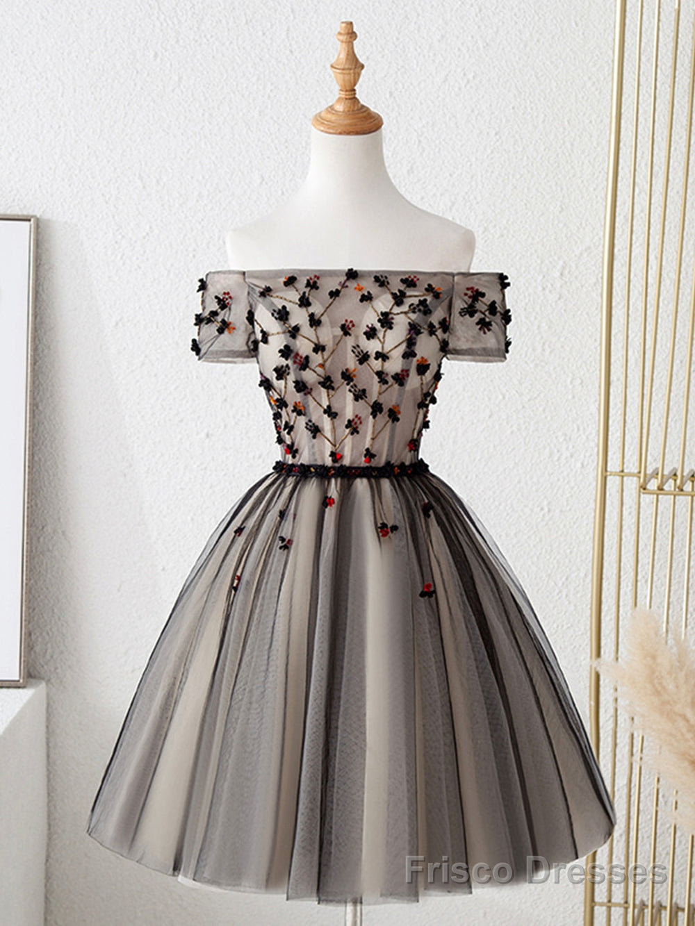 Cute Tulle Short Prom Dress with Flowers, Black Tulle Party Dress