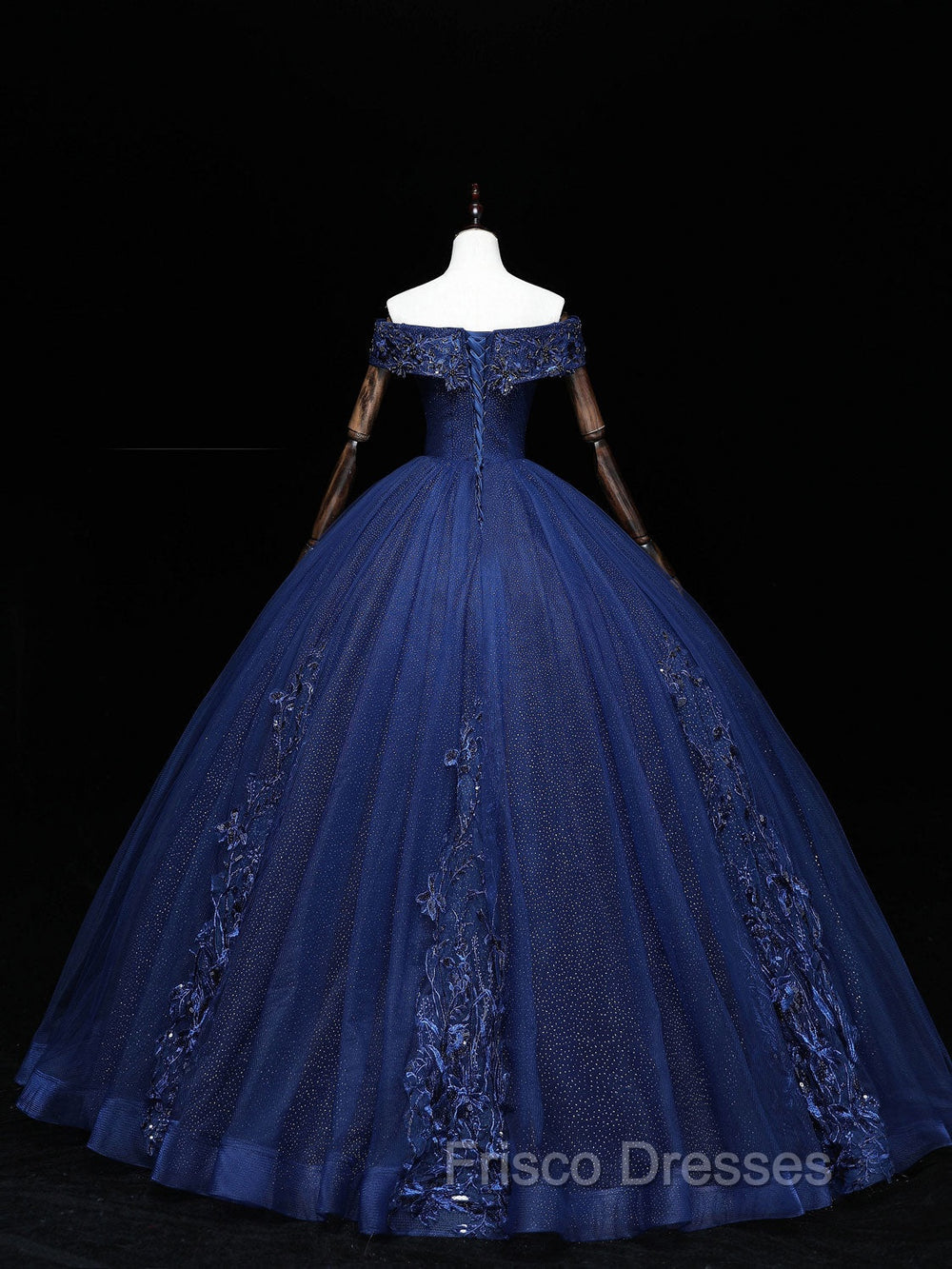 Dark Blue Off Shoulder Tulle Lace Long Formal Prom Gown, Blue Sweet 16 Dress With Beading Sequin