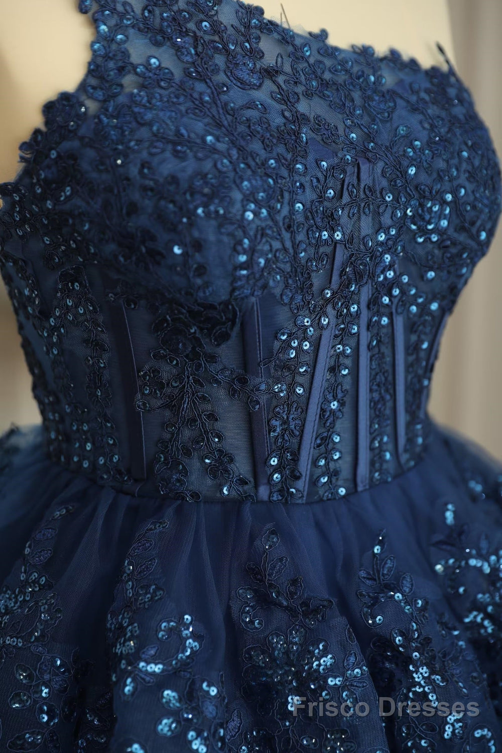 Dark Navy One Shoulder Appliques Multi-Layers Tulle Homecoming Dress
