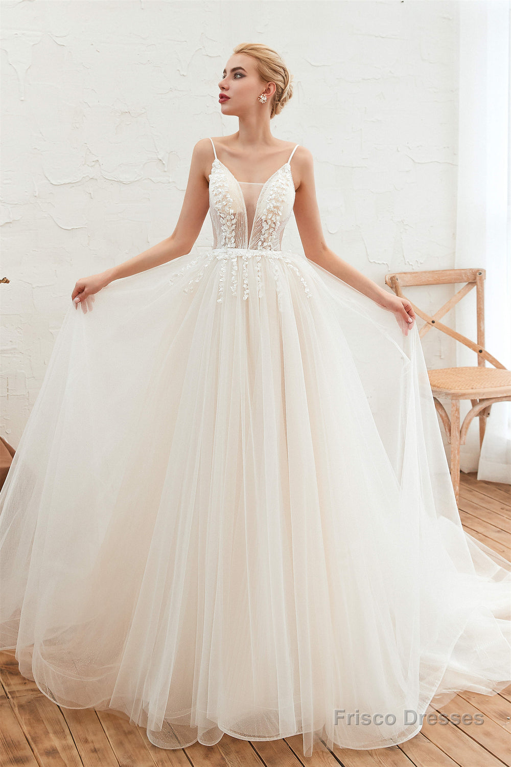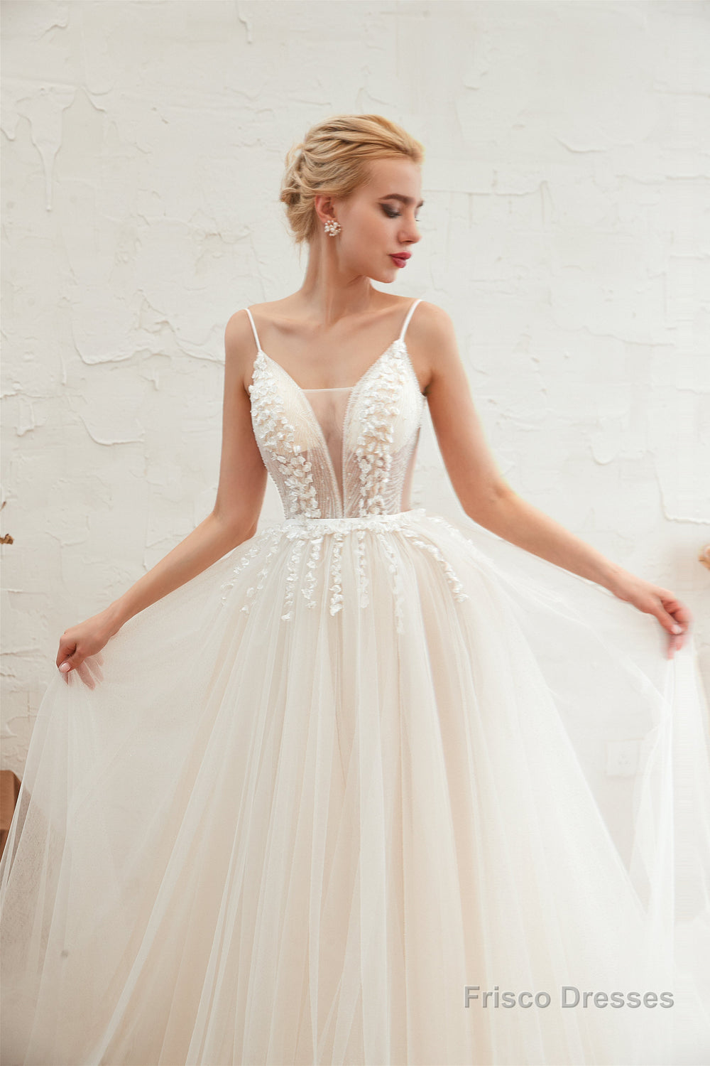 Deep V See Through Neck Bridal Dresses Spaghetti Straps Fairy Tulle Wedding Gowns