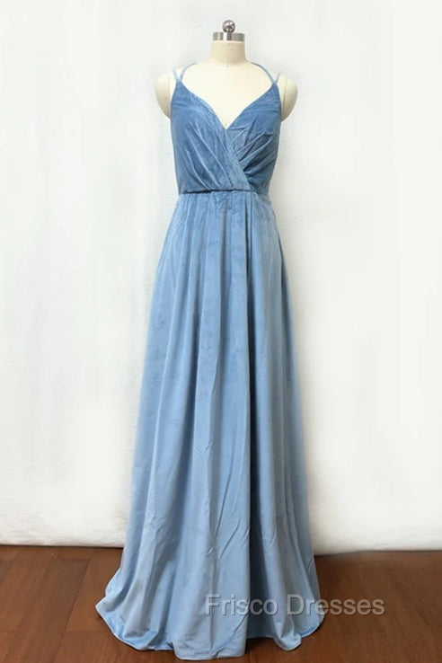 Double-Strap Dusty Blue Velvet Long Bridesmaid Dress