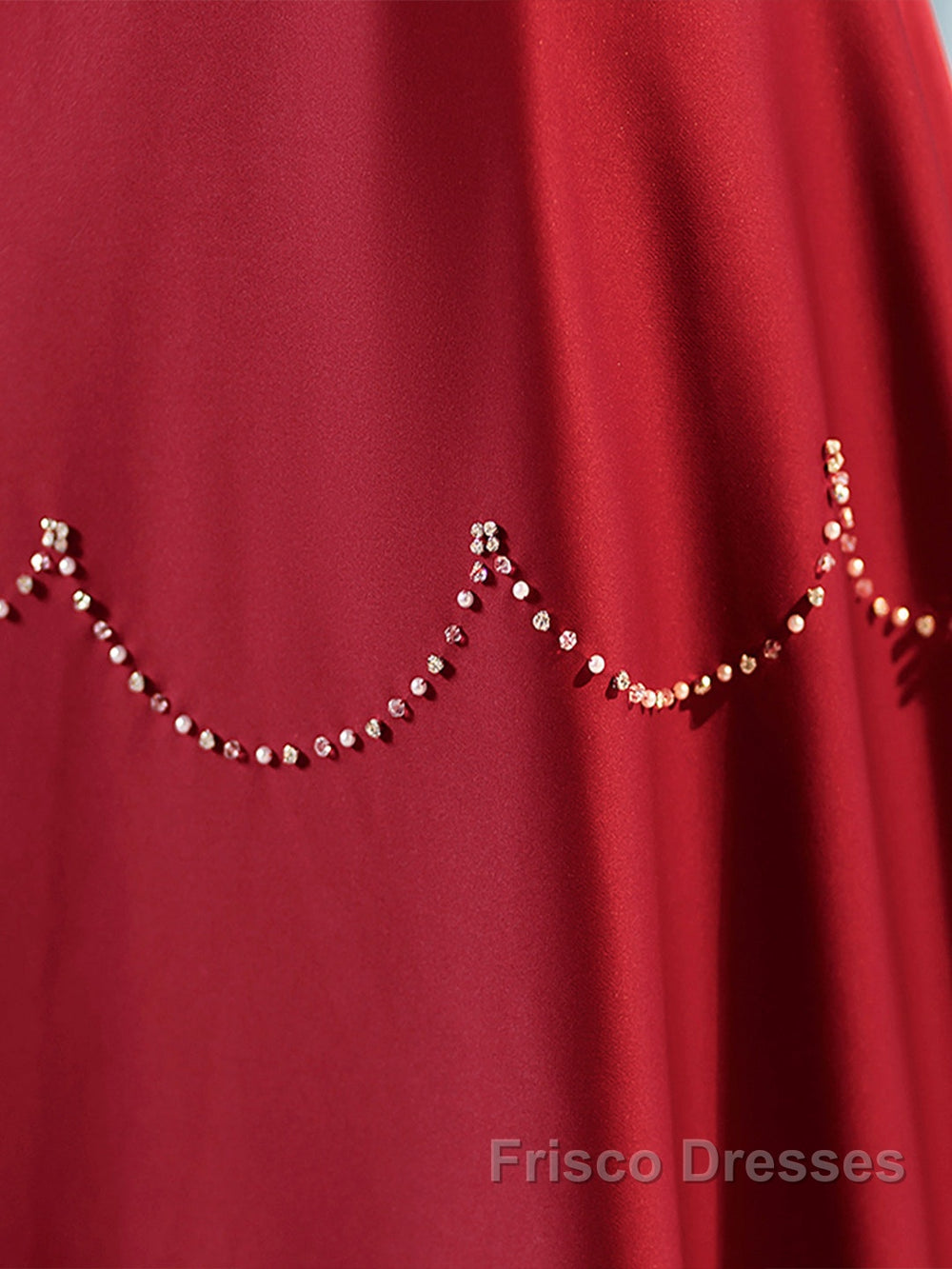 Elegant Burgundy Satin Long Formal Prom Dress With Beaded, Burgundy Short Sleeve Evening Dress