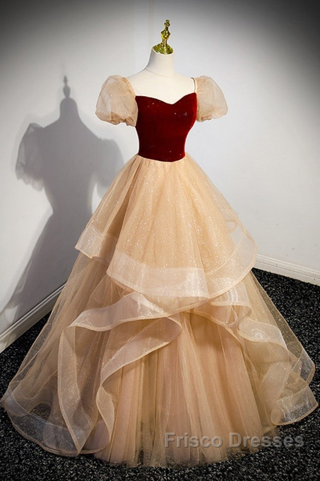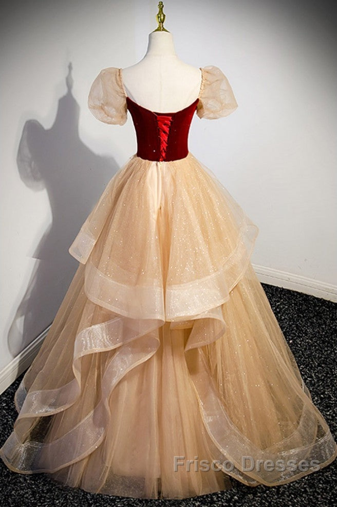 Elegant Burgundy Sparkling Sequin Square Neck Fluffy Short Sleeved Ball Dress, Burgundy Princess Sheer Backless Strap, Floor Length Layered Ruffle Edge Formal Prom Dress