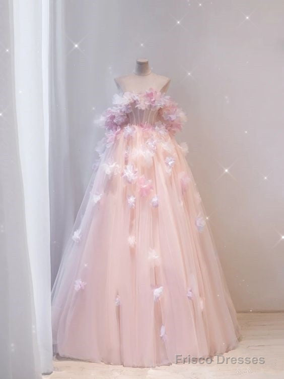 Fairy Ball Gown Strapless Pink Tulle Prom Dresses Long Party Dress
