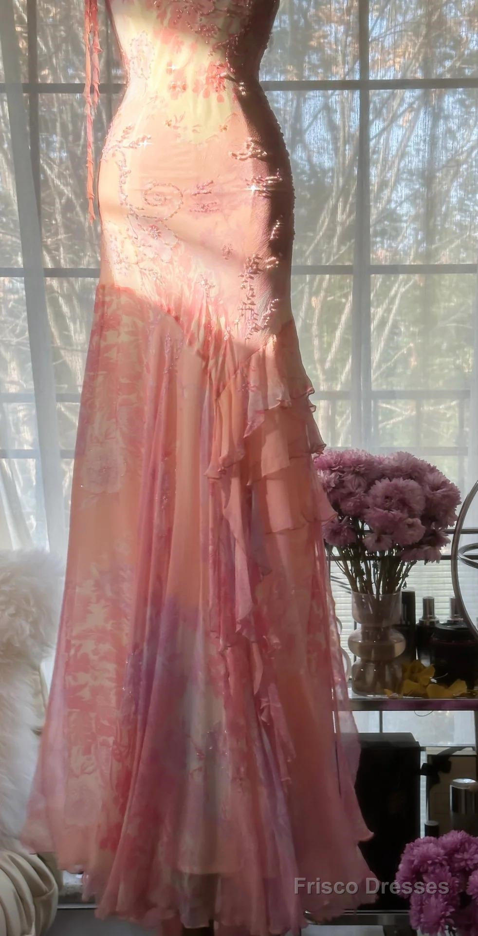 Fairytale Pink Mermaid Gown For Prom&Party-Vintage Spaghetti Strap Chiffon Beaded Long Evening Dress