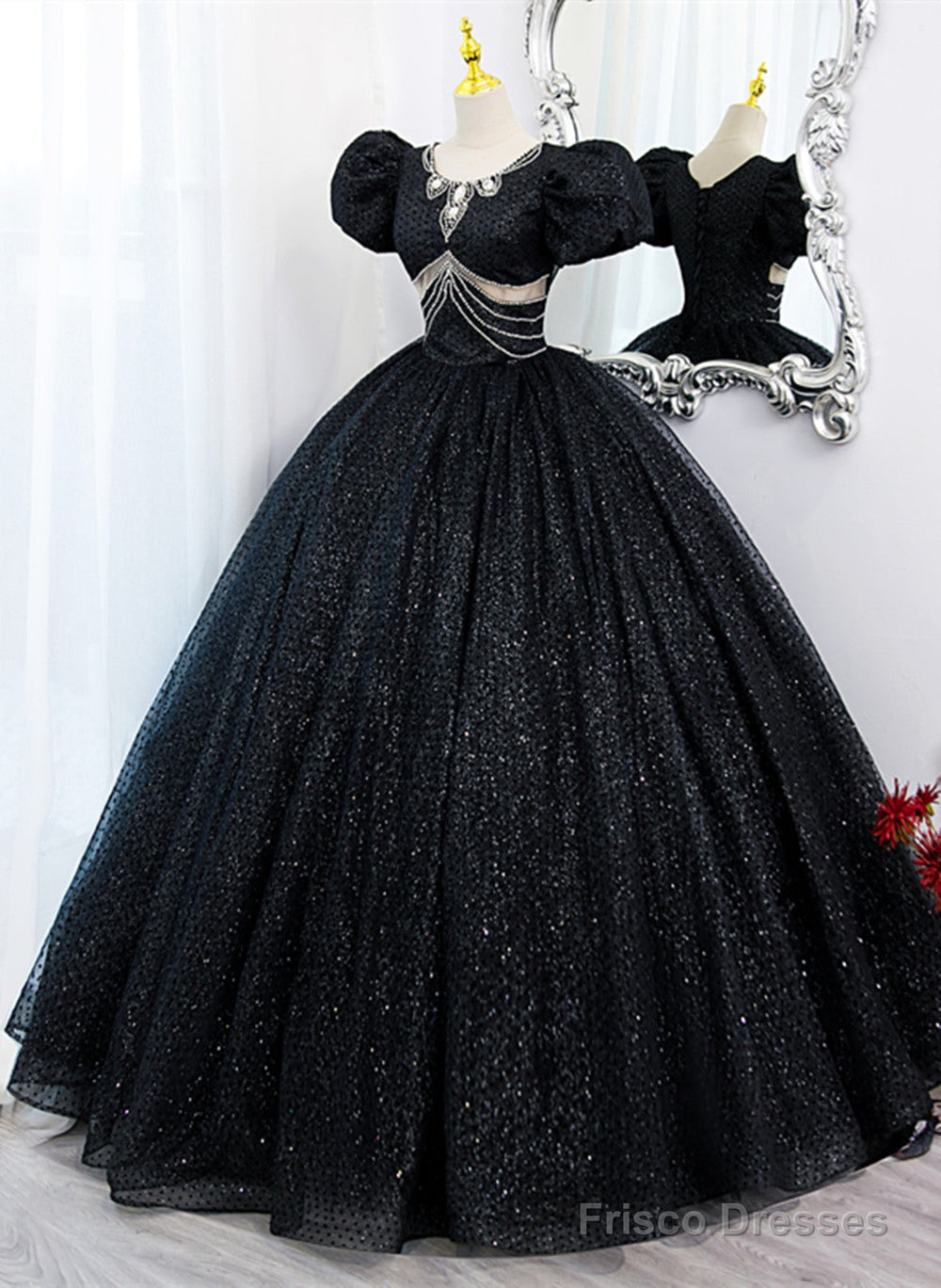 Glam Black Tulle Beaded Short Sleeves Prom Dress, Black Tulle Formal Dress Sweet 16 Dress
