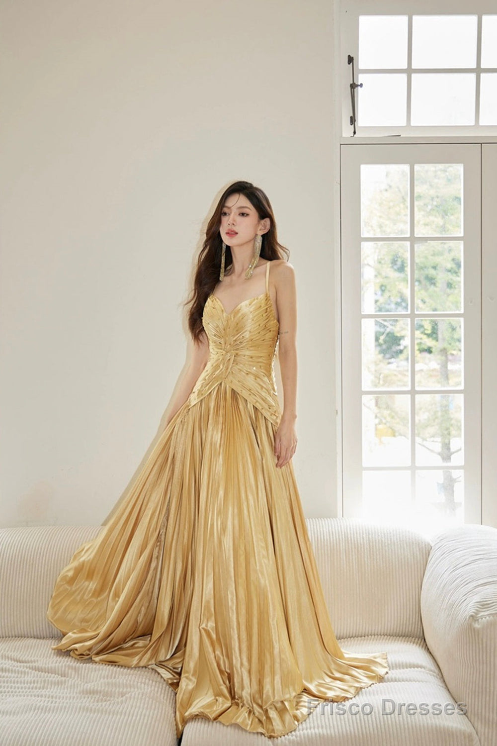 Gold Satin Long Backless Prom Dress, A-Line Spaghetti Strap Evening Party Dress