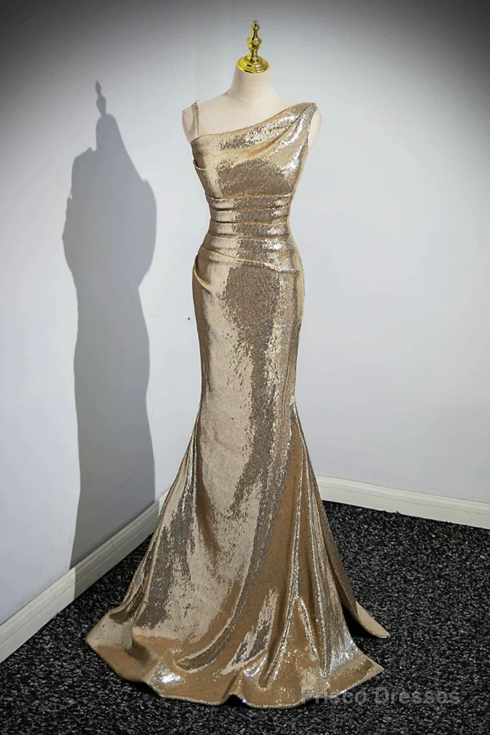 Gold Sequins Long Prom Dress, Mermaid One Shoulder Evening Party Dress