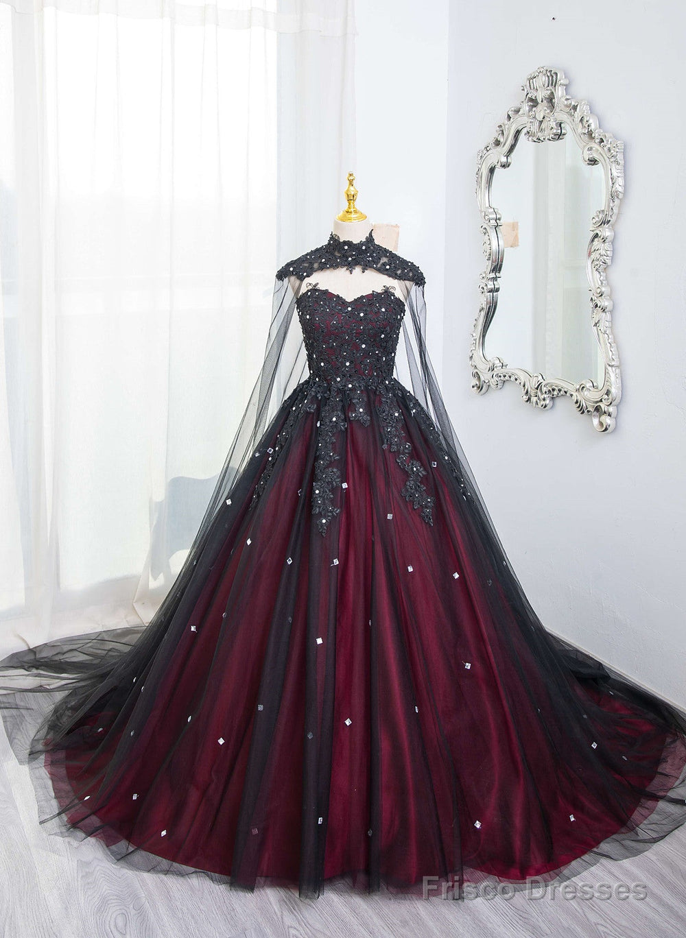 Gorgeous Black And Red Tulle Ball Gown Sweet 16 Dress With Cape, Long Prom Dress