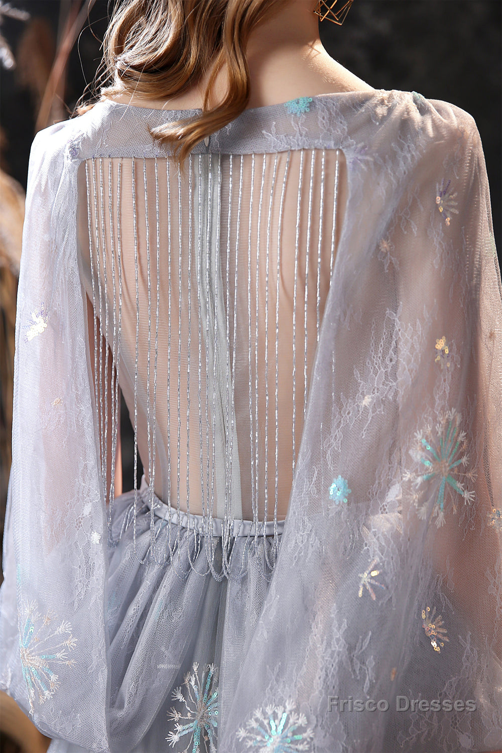 Gray Dandelion Lace V-neck Beading Back Prom Dresses