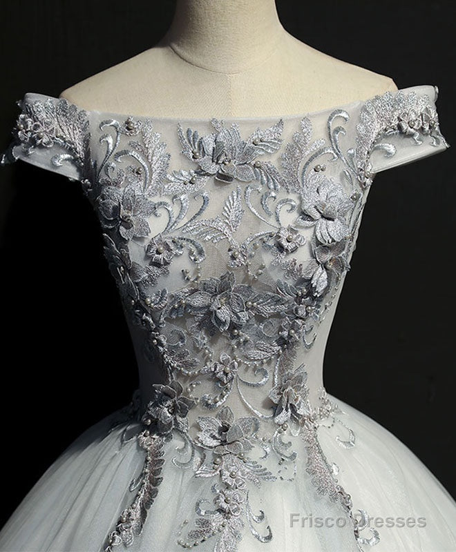 Gray Tulle Lace Off Shoulder Long Prom Gown Tulle Lace Evening Dress