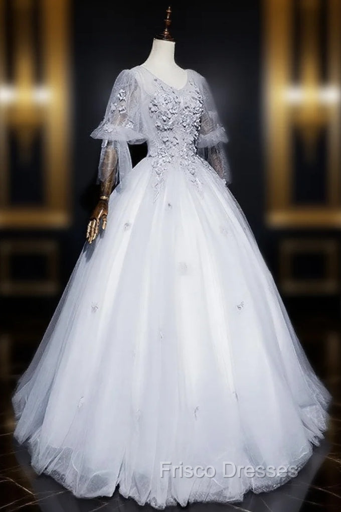 Gray V Neck Tulle Lace Long Formal Prom Dress, Gray Lace Evening Dress