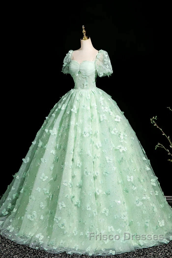 Green A-Line Tulle Beaded Sequin Long Formal Prom Dress, Beautiful 3D Butterfly Evening Dress