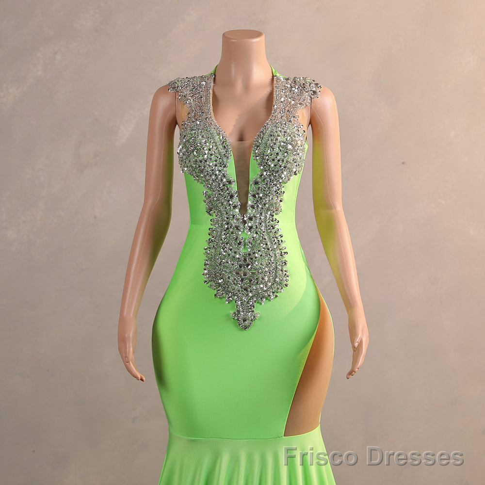 Green Mermaid V-NECK Prom Dresses Sequined Open Back Sleeveless Lace Crystal Formal Evening Party Gowns