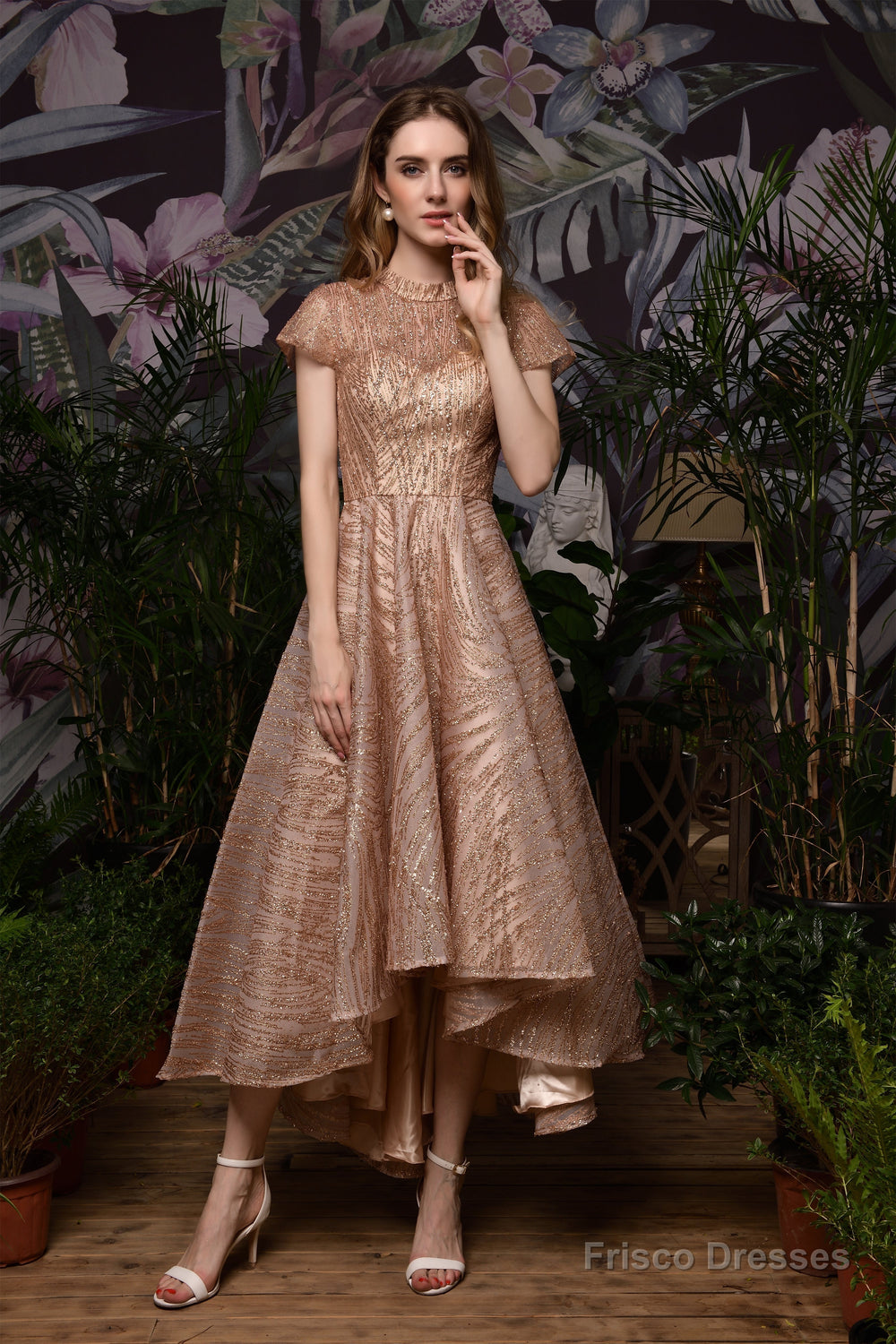 High neck Short Sleeve Champagne Sequined High Low Prom Dresses