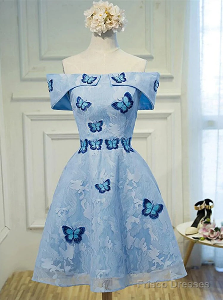 Light Blue Lace With Butterflies Short Homecoming Dress, Blue Prom Dress