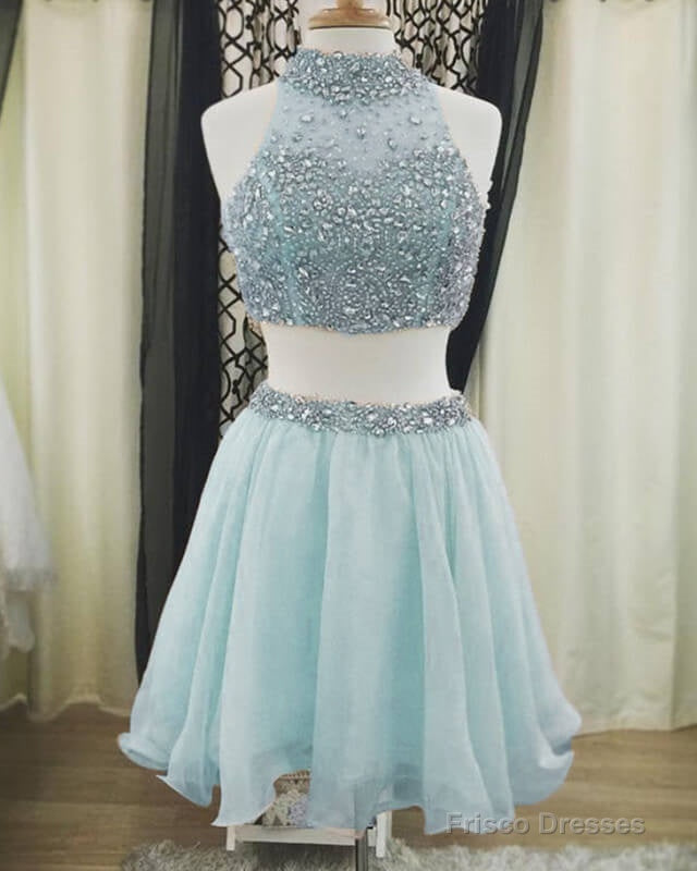 Light Blue Two Piece Homecoming Dresses Beaded Halter