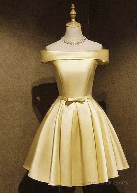 Light Yellow Satin Off Shoulder Knee Length Party Dress Prom Dress, Short Homecoming Dress