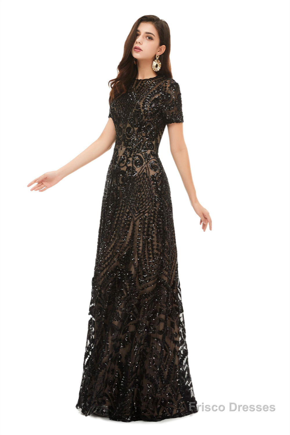 Long Black Sparkly Sequins Prom Dresses With Short Sleeves