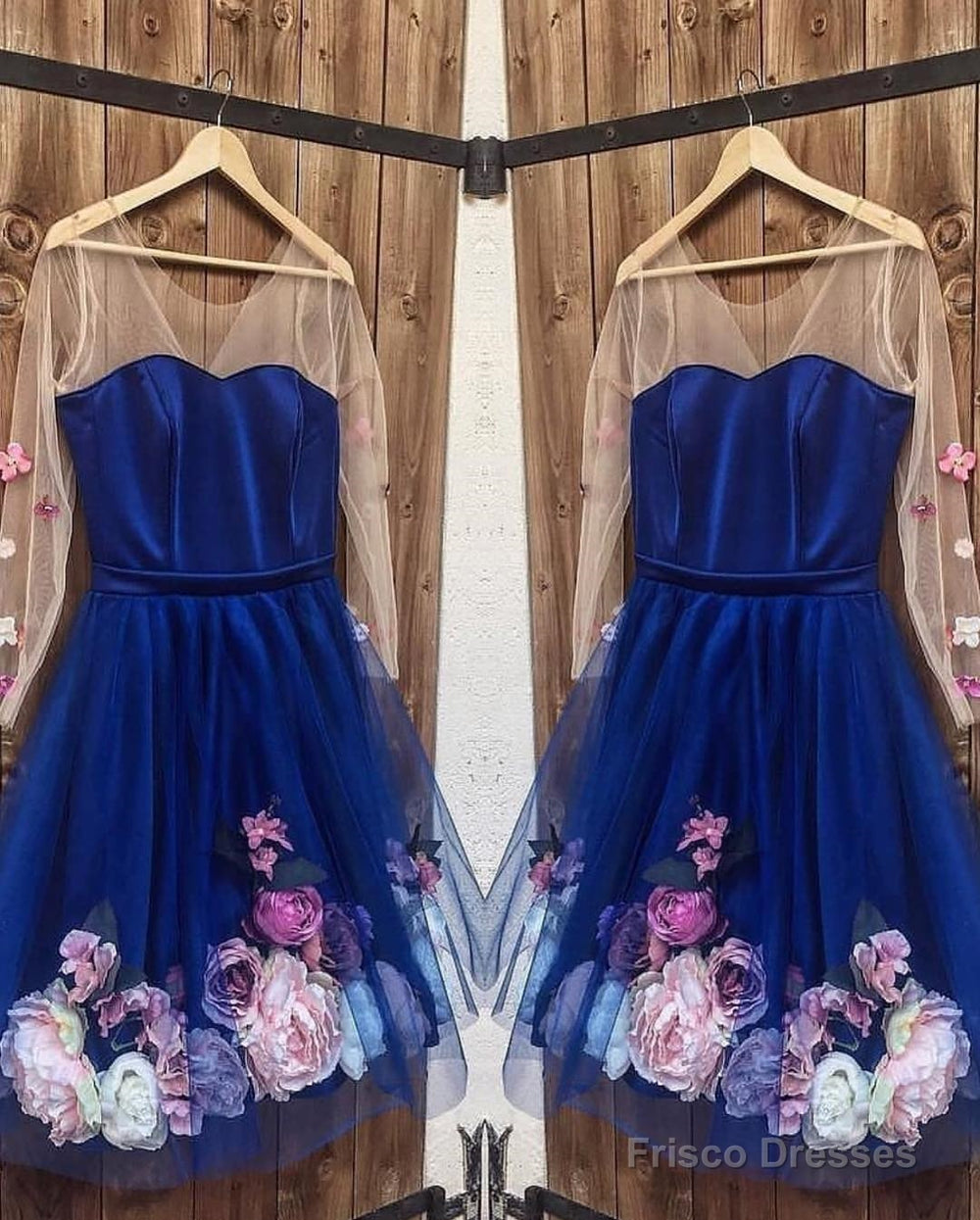 Long Sleeves 3D Floral Short Blue Prom Dresses, Short Blue Formal Graduation Homecoming Dresses