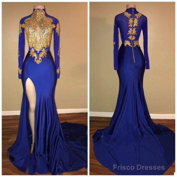 Long Sleeves Blue Gold Prom Dresses Side Slit Evening Gowns