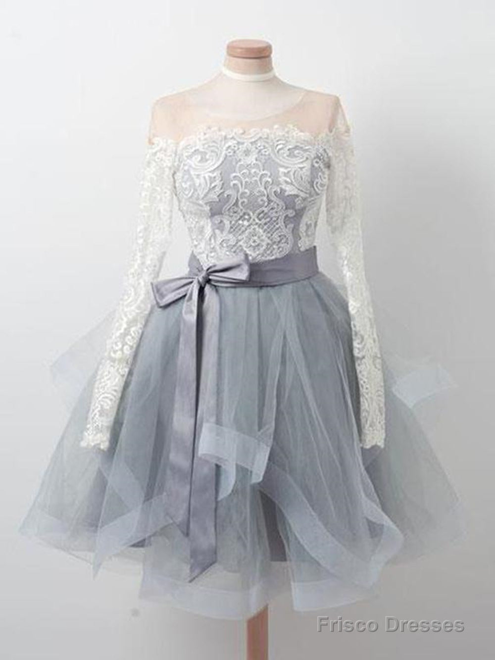 Long Sleeves Short Gray Prom Dress With White Lace, Long Sleeves Short Lace Graduation Homecoming Dresses