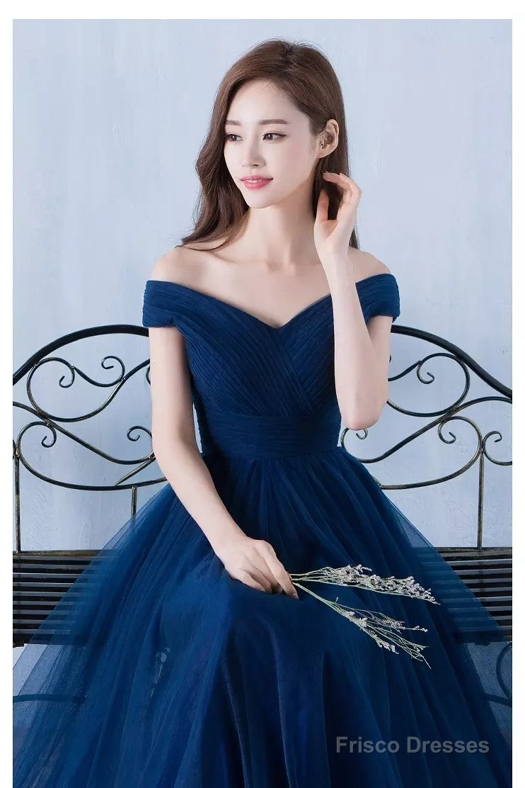 Lovely Navy Blue Tulle Off Shoulder Long Prom Dress , Tulle Bridesmaid Dresses