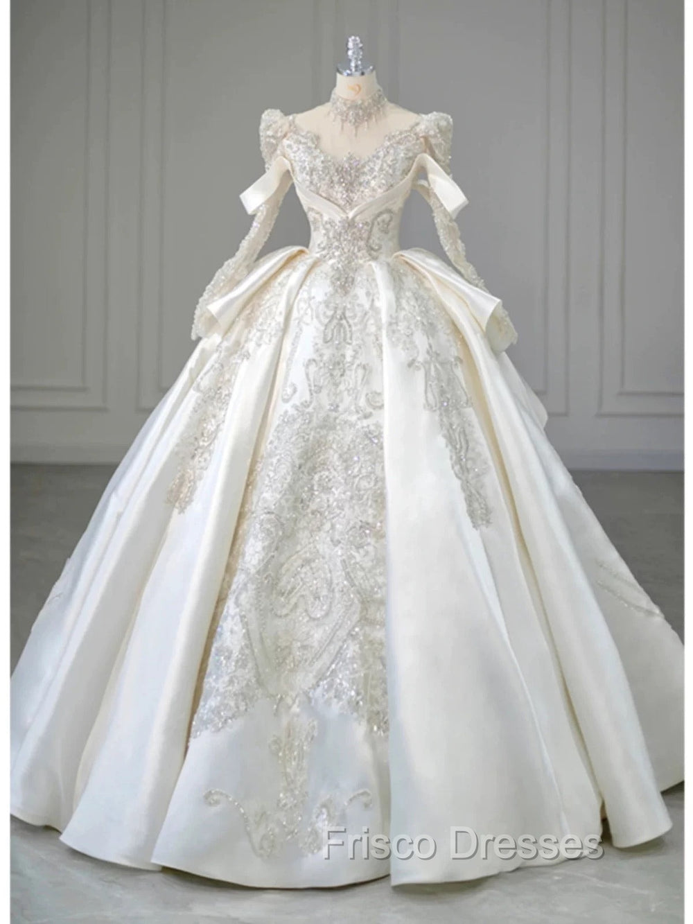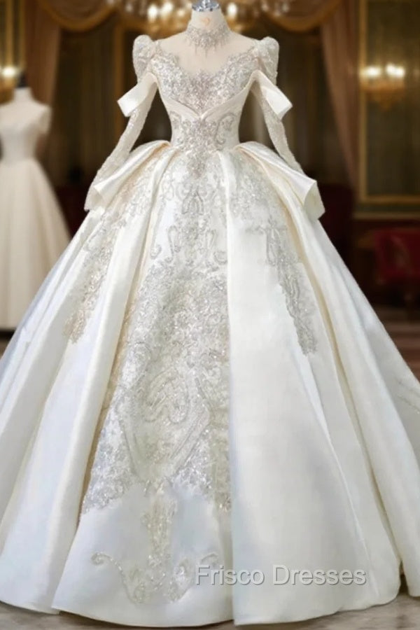 Luxury Ball Gown High Neckline Long Sleeves Sequin White Wedding Dress Brides Dress