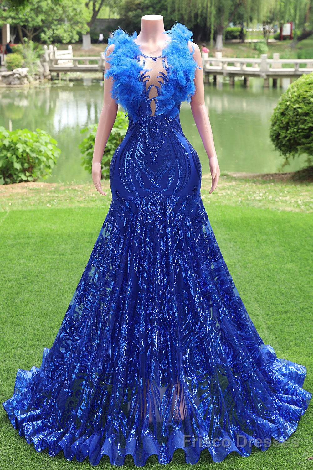 Mermaid Long Prom Dresses Sequin Royal Blue Evening Dresses Feather Sleeveless