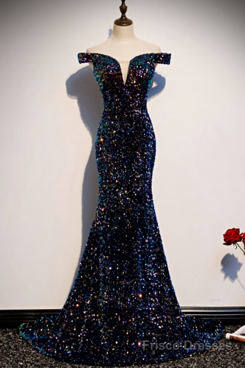 mermaid navy blue sequins evening dress with off the shoulder top prom dress formal dress