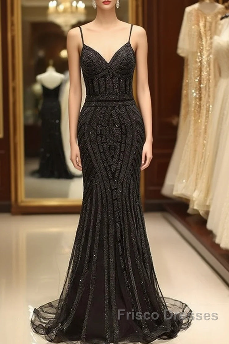Mermaid V Neck Sequined Black Formal Prom Dress Spaghetti Straps