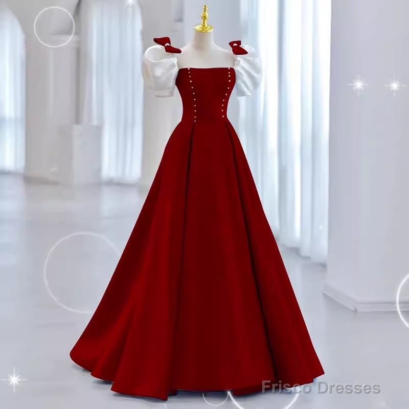 Modest A Line Long Short Sleeves Satin Red Prom Dresses