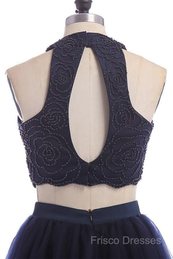 Modest Two Pieces Sleeveless Hollow Navy Blue Homecoming Dress