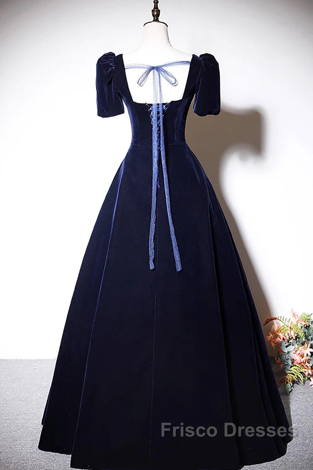 Navy Blue A-Line Velvet Long Evening Dress, Short Sleeves Beaded Formal Prom Dress
