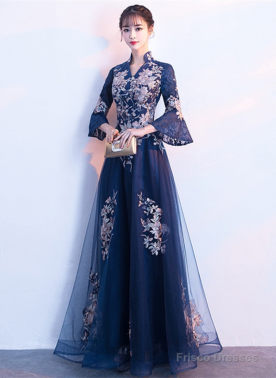 Navy Blue Long Sleeves A-Line Party Dress, Navy Blue Bridesmaid Dress Prom Dress