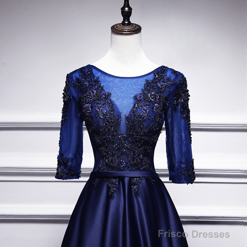 Navy Blue Satin With Lace Short Sleeves Long Prom Dresses, Blue Evening Dresses Formal Dress