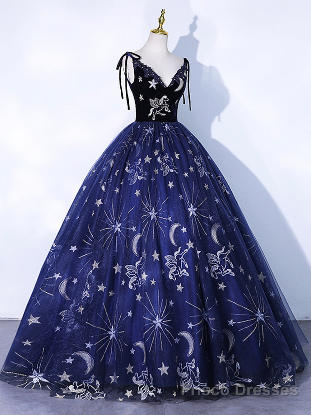 Navy Blue Tulle Long Prom Dress, Spaghetti Straps Lace Flower Backless Evening Dress