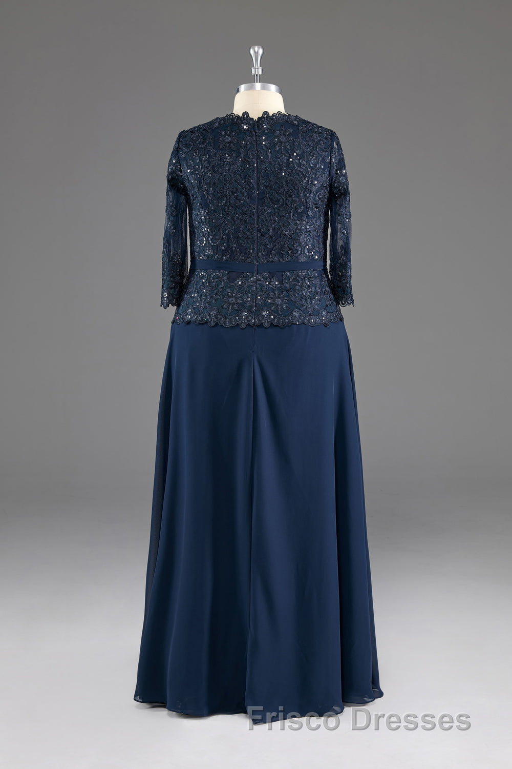 Navy V-Neck Long Sleeves Lace Appliques Chiffon Formal Prom Dress