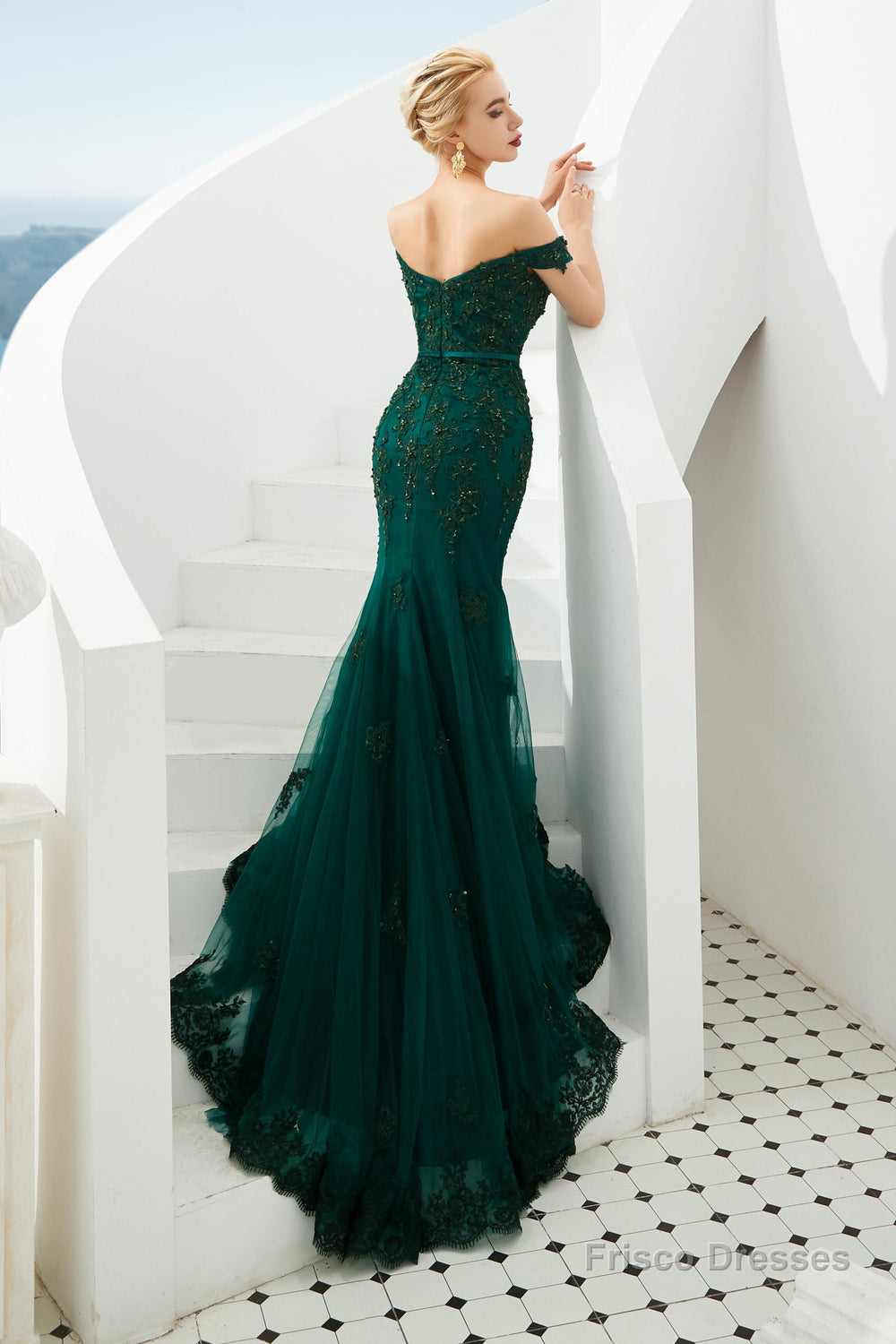 Off Shoulder Mermaid Dark Green Formal Evening Dresses with Lace