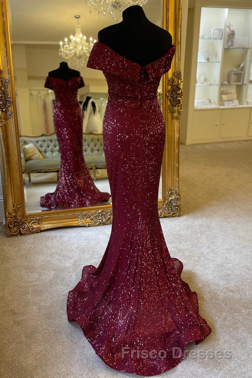 Off the Shoulder Burgundy Sequins Mermaid Long Formal Prom Dress
