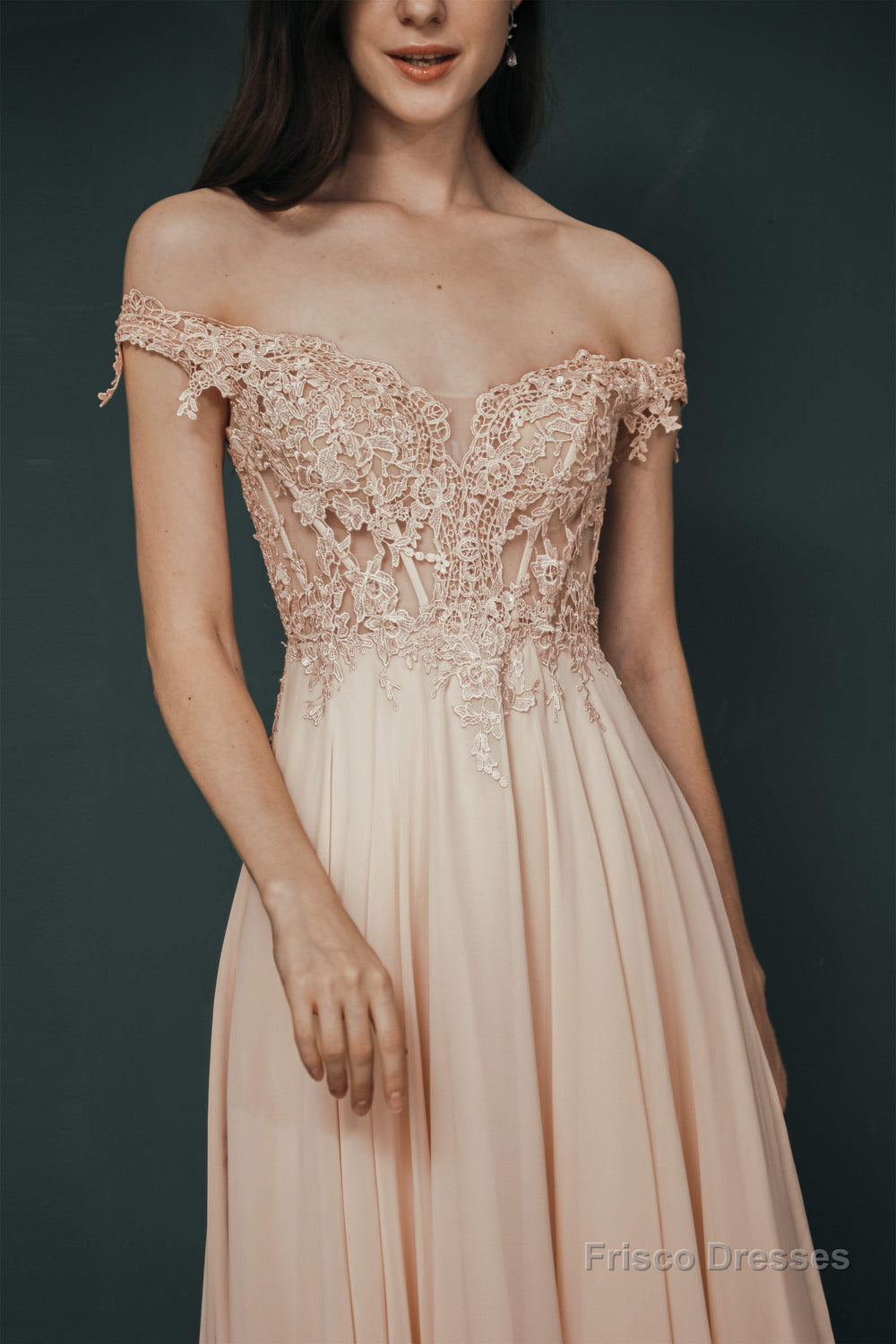 Off The Shoulder Charming Long Chiffon Prom Dresses With Appliques