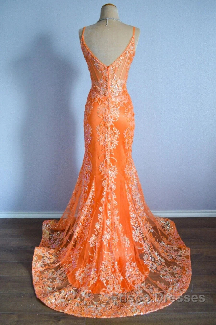Orange Mermaid Spaghetti Straps Sequins Applique Long Formal Prom Dress Tulle Evening Dress