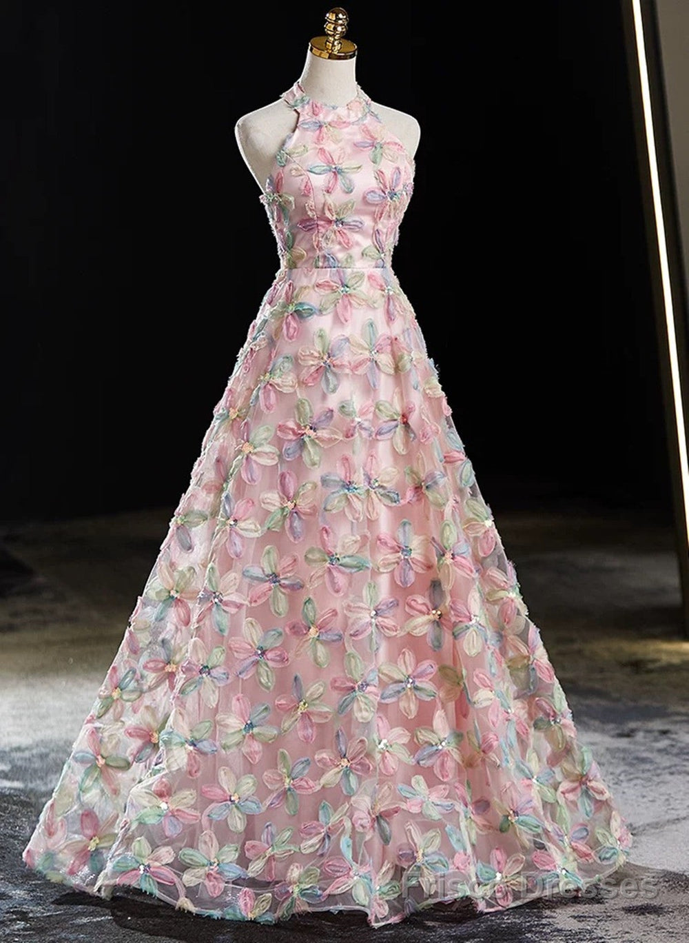 Pink Halter Lace A-line Floor Length Party Dress, Pink Lace Prom Dress