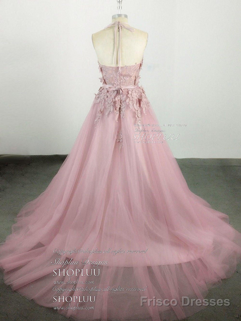 Pink High Neck Tulle Lace Applique Long Prom Dress, Pink Evening Dress
