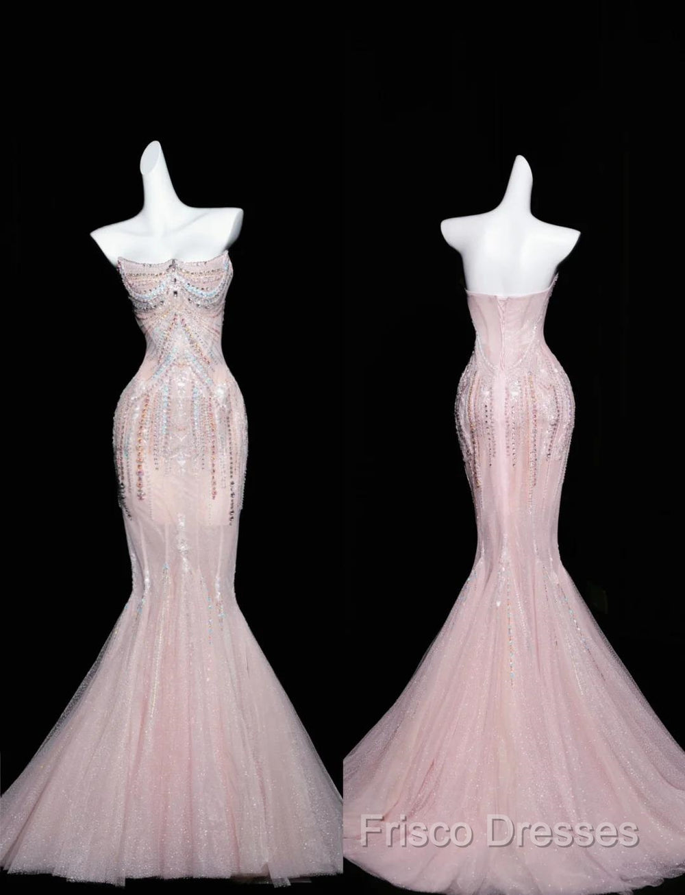 Pink Mermaid Strapless Tulle Diamond Long Formal Prom Dress Sweet Wedding Dress Formal Dress