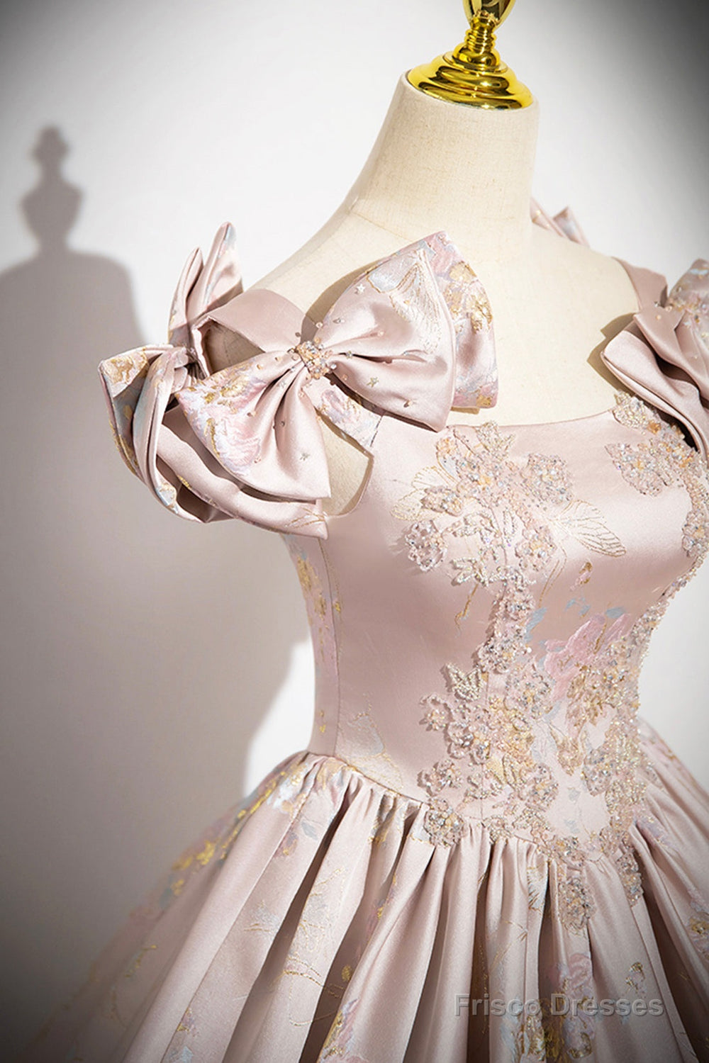Pink Satin Lace Long Prom Dress, A-Line Scoop Neckline Formal Evening Dress