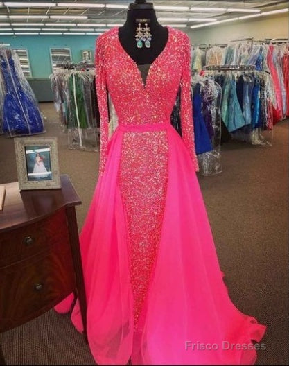 Pink Sequin Prom Dresses Long Sleeves V Neck Evening Gowns With Train