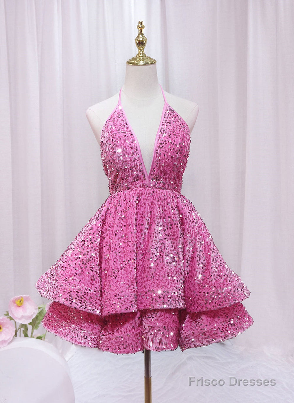 Pink Sequins Halter Backless Short Homecoming Dress, Pink Short Prom Dress